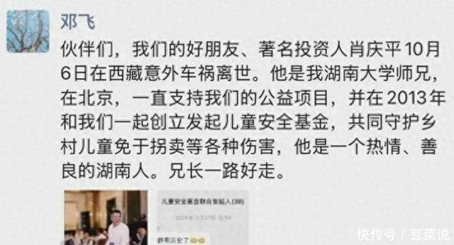 除了投资,他还爱做慈善。 2013年,肖庆平和邓飞还有一帮好朋友创办了“儿童安全基金”,为了守护留守儿童,防拐卖等,他们不停奔走、筹钱,还在各种场合上位公益发声。